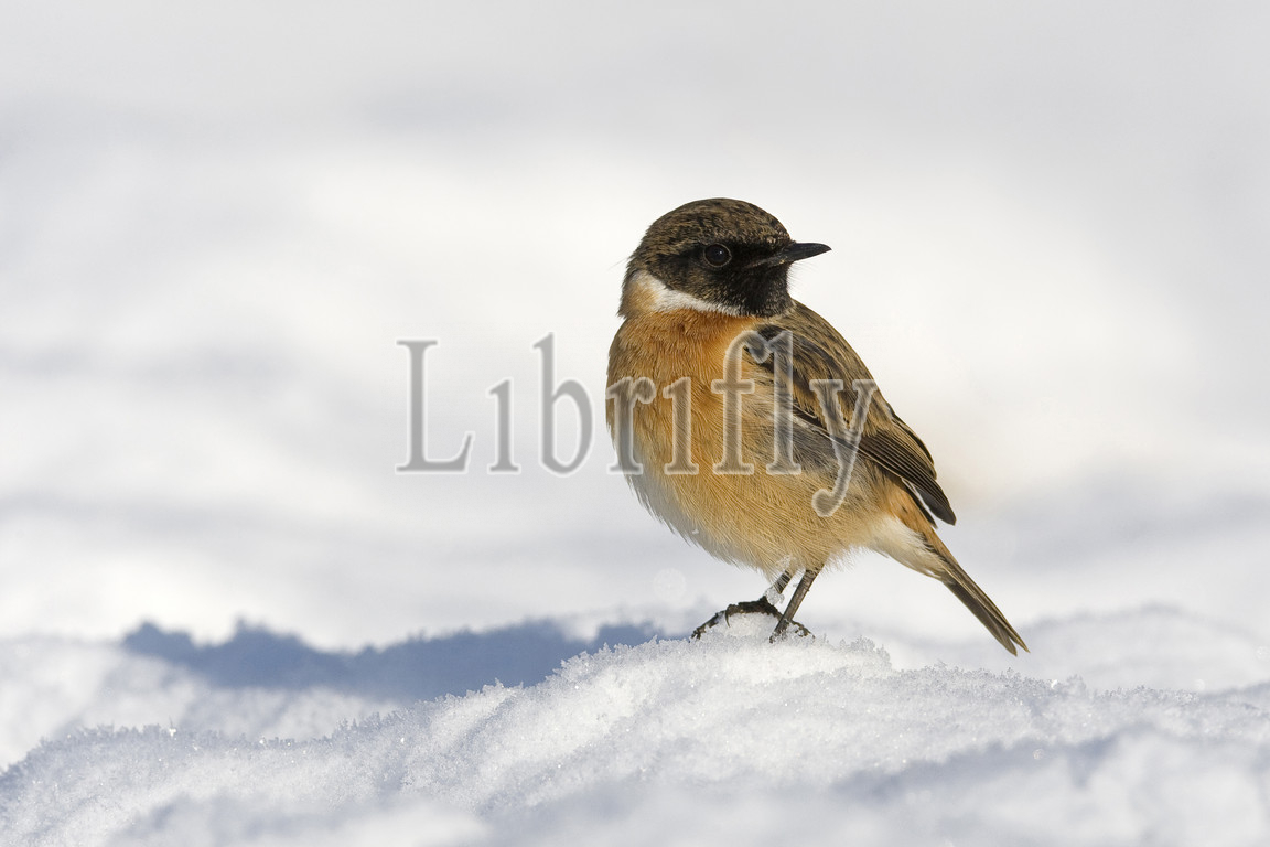Adult, Male, European Stonechat, perched, snow, Saxicola rubicola, Italy, nature, bird, animal, wildlife, wild, fauna, natural, feather, sky, beak, wing, outdoor, freedom, colourful, Liszt, Natural History, ornithology, vertebrate animals, photography, color image