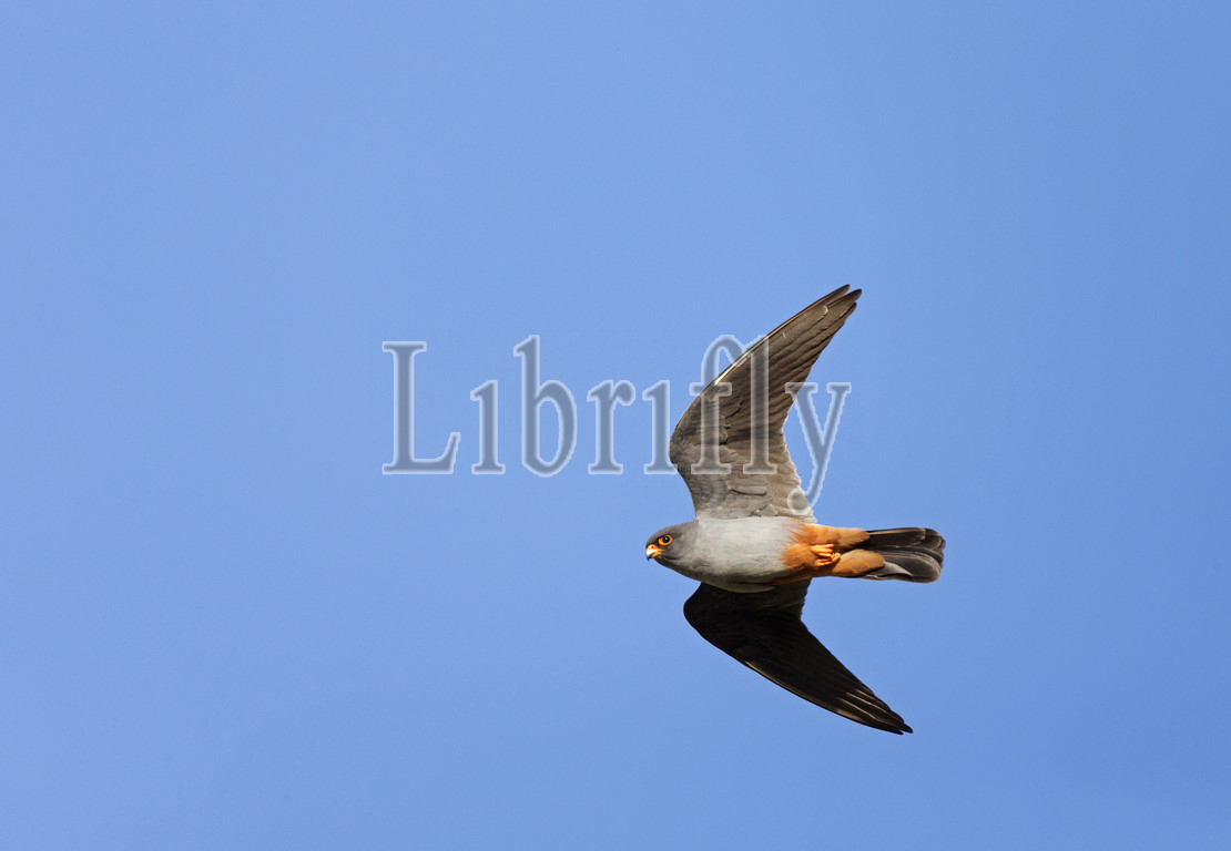 Adult male Red-footed Falcon flying against blue sky, Falco vespertinus, Spain