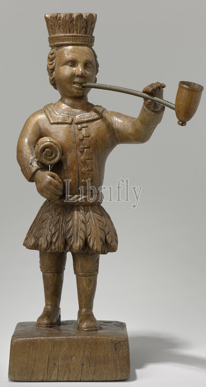 Advertising image, tobacco trade, sale, Standing man, loose pipe, left hand, roll, carts under, right hand, tobacco, ground, man wears, striking combination, clothing, consisting, European jacket, buttons, leather boots, combined, items, characteristic, original population, America, feather headdress, skirt, tobacco leaves, held, object, lost, statue stands, pedestal, together, statue, carved, piece, wood, tobacco Indian, Virginian, 1700, 1800, beeld