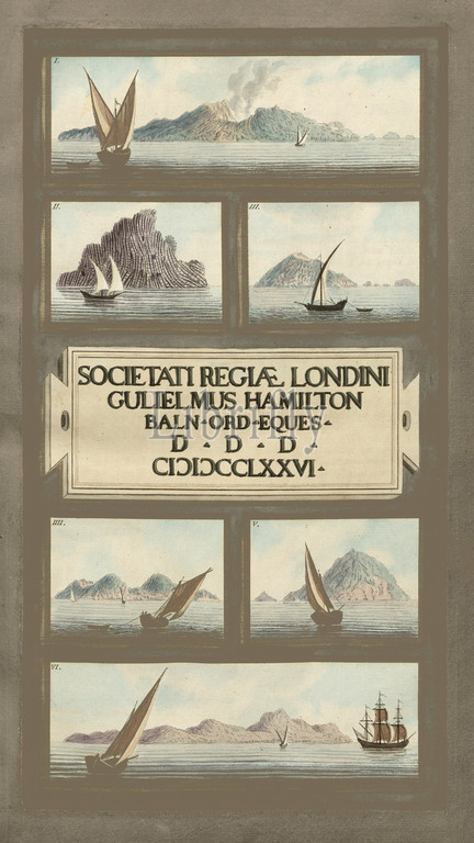 Aeolian Islands, Representation, Aeolian Islands, copperplate engraving, hand colored, Fabris, Pietro, 1776, William Hamilton, Campi Phlegraei, Observations, Volcanos, two Sicilies, communicated, Royal Society, London = Observations sur les volcans des deux Siciles, Naples, s.n., 1776