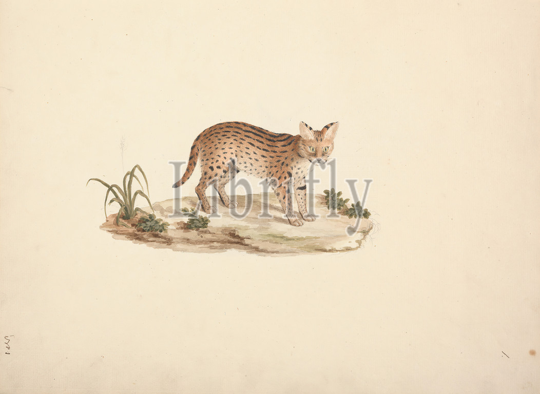 African Wildcat or Serval, Luigi Balugani, 1737–1770, Italian, undated, Watercolor and graphite on medium, slightly textured, cream laid paper, Binding: 16 inches (40.6 cm) and Sheet: 15 7/8 × 12 1/2 inches (40.3 × 31.8 cm), animal art