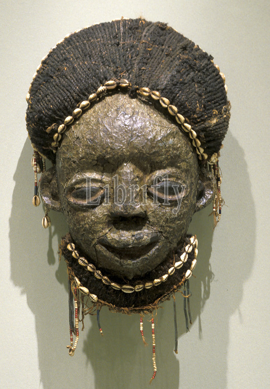 Akam mask, Kom, early 20th century, wood, pigment, metal, shells, fiber, 18-1/4 x 13 x 8-1/2 in., African Art