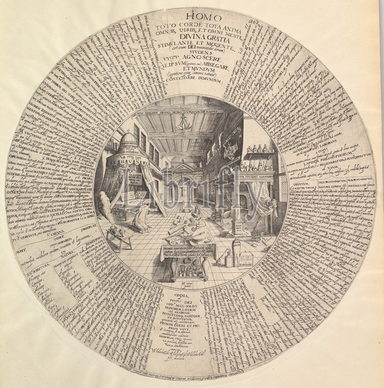 Alchemist, Laboratory, Heinrich Khunrath, Amphiteatrum sapientiae aeternae, n.d, Engraving, circular plate, sheet, diameter 16 1/8, 41 cm, Prints, Attributed to Peter van der Doort, born Antwerp, active Hamburg ca., 1590–1605, After Hans Vredeman de Vries, Netherlandish, Leeuwarden, 1527–1606, Antwerp