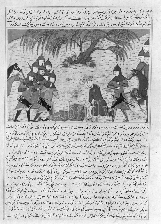 Alexander, Great, Dying Darius, Folio, Majma, al-Tavarikh, Compendium, Histories, Hafiz, Abru, ca, 1425, Attributed, Afghanistan, Herat, Opaque watercolor, silver, gold, brownish paper, 17 x 13in, 43.2 33cm, Codices, Written, court historian Hafiz, modelled, Ilkhanid Jami, text, al-Tavarikh begins, time, Adam, continues, rule, Shah Rukh, r, 1405–47