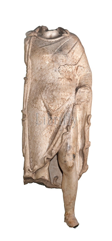 Alexander the Great (type Aigiochos), Marble, chiseled, Total: Height: 135.5 cm; Width: 55.5 cm; Depth: 25.5 cm, Three-dimensional sculptures, Portrait of a ruler, State portrait, History of Alexander the Great, Alexander the Great, Middle Imperial Period, Roman copy after a Greek original Under life-size marble statue of a man with a short coat (Greek: Chlamys) in the shape of an Aigis (mythical goatskin). The left arm is bent and stretched out. The right leg was used as a supporting leg, while the left one is slightly bent and set aside to the side. As a robe the figure wears a Macedonian chlamys, a simple garment that is scaled and has a snake edge and a gorgoneion on the chest. Between the gorgoneion and the left elbow is a boss - a reference to a copy of the Roman Imperial period. The back is flat, its elaboration only hinted at. The fact that this statue was placed in a niche testifies to its orientation towards the front. The scale pattern, the snake hem and the gorgoneion may have been colored in the past, as evidenced by small traces of red paint on the edges of the scales. Due to further copies of this type, where the head is preserved, this statue can be safely named as that of the Macedonian king Alexander the Great (r. 336-323 BC). Originally, he still held a scepter and - like the father of the gods Zeus - a bundle of lightning in his hands. Already in Homer's Iliad Zeus is mentioned as the aegis bearer. Alexander was the first mortal to be depicted with Aigis and Gorgoneion. Possibly this type of statue goes back to a cult image of Alexander as founder of the city of Alexandria. This might not have originated before 311 BC.
