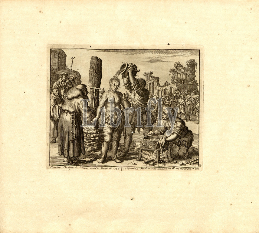 Algerius, student of Padua, burned in Rome, Anno 1557, Parallel title: Algerius, student of Padua, at Rome, buried, A nn o 1557, copperplate engraving, 69.), p. 147, Luyken, Jan (inv. et fec.), Jan Luyken: Théâtre des martyrs: depuis la mort de J.Christ jusqu'à present: représenté en très belles tailles-douces = Schau-Bühne der Martyrer; gezeichnet und in Kuppfer gestochen. Leyde: chez Pierre Van der Aa, [1711]