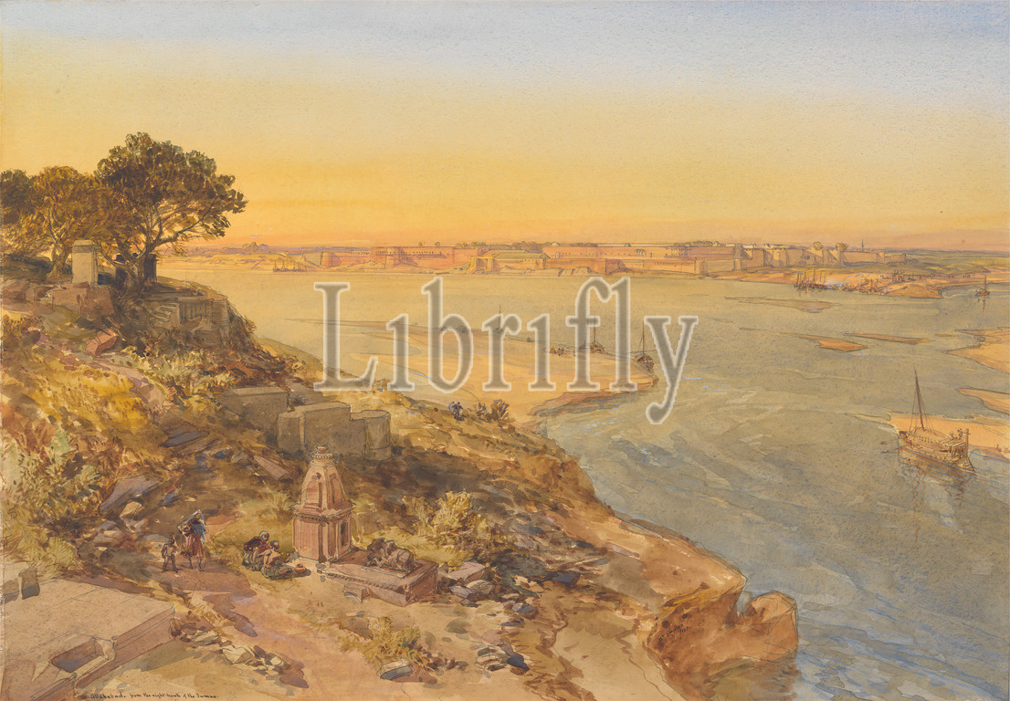 Allahabad, Right Bank, Jumna, William Simpson, 1823–1899, British, 1865, Watercolor, gouache, graphite, moderately thick, moderately textured, cream wove paper, Sheet, boats, cityscape, figures, fort, fountain, genre subject, landscape, military art, river, riverbanks, ships, sunset, walls, Allahabad, Ganges, India, Punjab, Yamuna