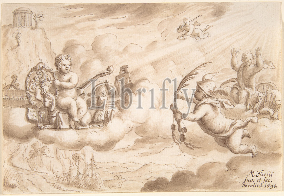 Allegory of Art and Knowledge with the Coat-of-Arms of Hans Wilpert Zoller, 1694, Pen and brown ink, brush and brown wash, sheet: 3 11/16 x 5 7/16 in. (9.4 x 13.8 cm), Drawings, Mathais Füssli the Youngest (Swiss, Zurich 1671–1739 Zurich)