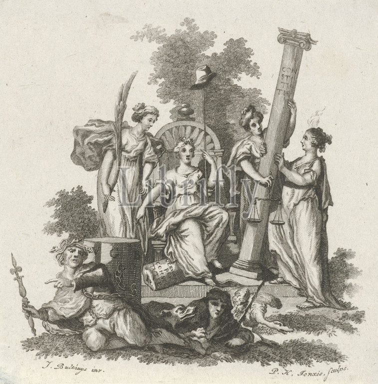 Allegory, Constitution, Dutch Virgin, seated, throne, stick, hat, liberty, hand, points, chained figure, foreground, rejected Constitution, flanked, woman, palm branch, female personification, Justice holding, column together, another woman, new Constitution, Abstract Ideas, Concepts, allegorical scene, ie two, personifications involved, action, Justice, Justitia, Giustitia divina, Ripa, Four Cardinal Virtues, personification, city, town-patron, ess, variant, Pieter Hendrik Jonxis, mentioned, object, Utrecht, 1772, 1843, paper, engraving
