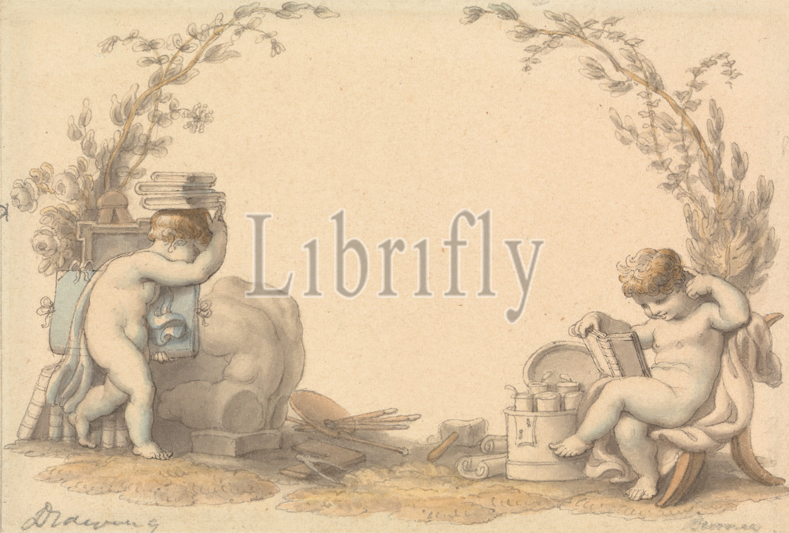 Allegory, Drawing, Edward Francis Burney, 1760–1848, British, Pen, black ink, graphite, watercolor, medium, slightly textured, cream wove paper, Sheet, allegory, books, carrying, cherubs, compass, easel, flowers, palette, portfolio, religious, mythological subject, scrolls, sculpture, vines