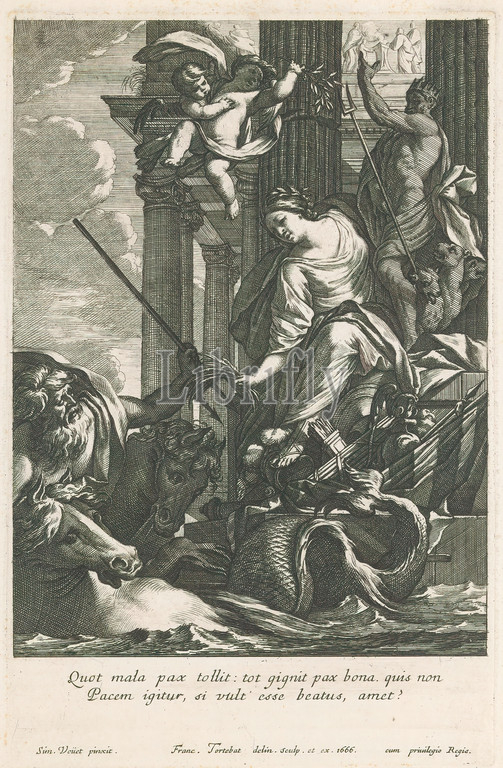 Allegory of Peace, Peace seated on arms and helmets hands corn to Neptune; a temple and statue of Pluto behind her, print maker: François Tortebat, (mentioned on object), after painting by: Simon Vouet, (mentioned on object), publisher: François Tortebat, (mentioned on object), print maker: Paris, after painting by: France, publisher: Paris, France, 1666, paper, engraving, etching, height 324 mm × width 210 mm