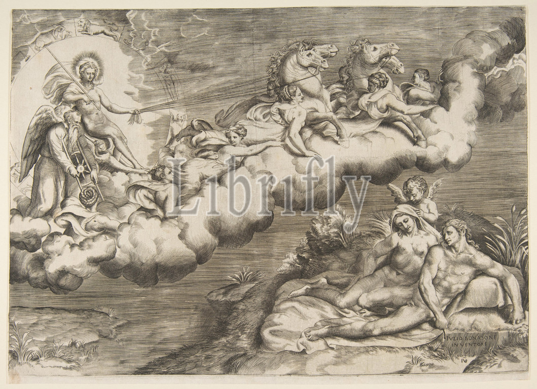 An allegory of the rising sun, a naked man wearing a shroud and accompanied Father Time is being drawn by horses, 1531–76, Engraving, sheet: 9 3/4 x 13 3/8 in. (24.8 x 34 cm), Prints, Giulio Bonasone (Italian, active Rome and Bologna, 1531–after 1576)