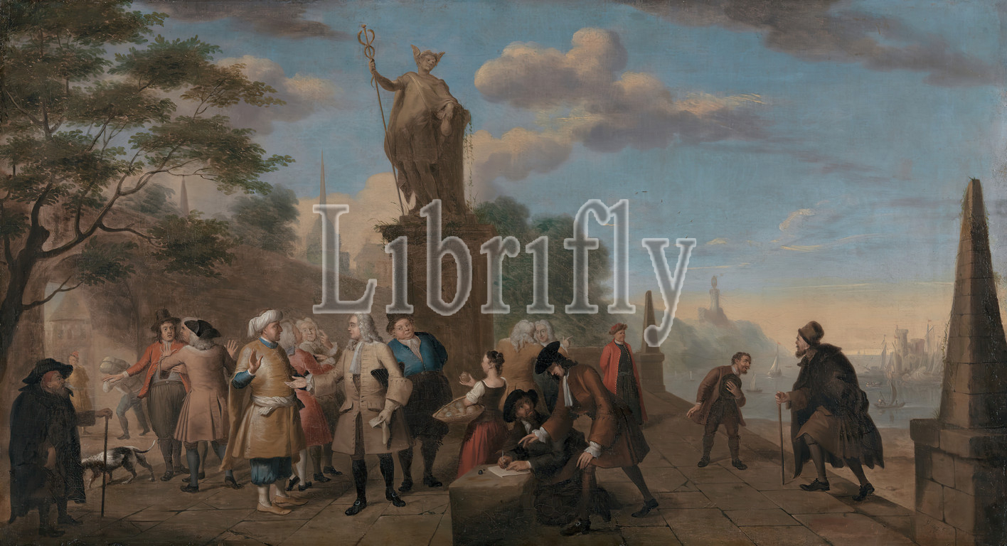 Allegory, Trade, John Theodore Heins, 1697–1756, German, active, Britain, 1720, 1743, Oil, canvas, Support, PTG, allegory, banks, basket, city, men, river, statue, trade, turban, wall, water, woman, writing, processes