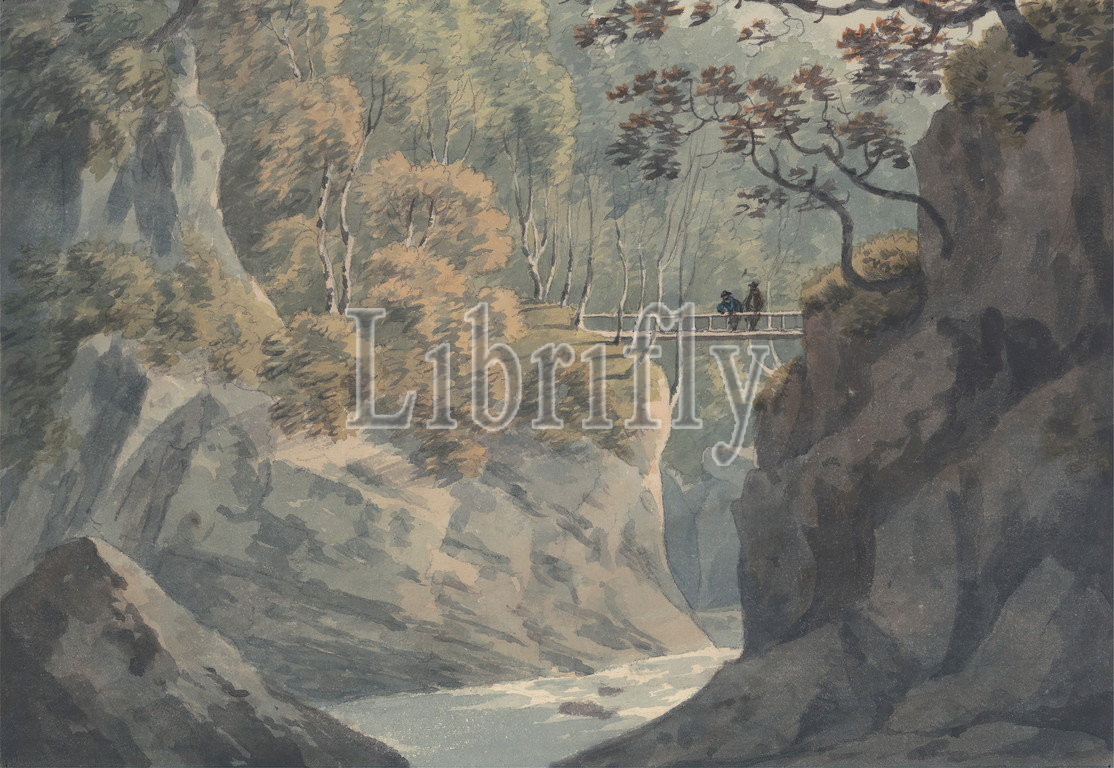Alpine Bridge, Woodland Scenery, Pistil y Maw, John Warwick Smith, 1749–1831, British, Watercolor, graphite, medium, slightly textured, cream wove paper, Sheet, Contemporary drawn border, bridge, built work, cliffs, forest, landscape, men, river