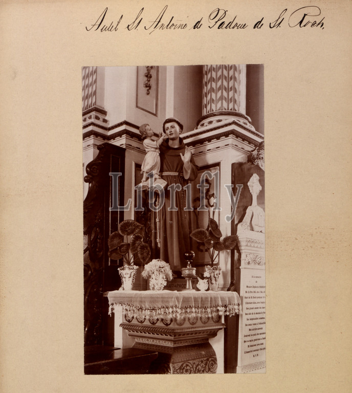 Altar St. Anthony, Padua, St. Roch, Photograph, statue, represents saint Anthony, inside, old church, demolished, 1918, St. Roch parish, Qu�bec, Quebec, Canada, right, plaque, honour, Z�phirin Charest, 1813-1876, parish priest, 1839, death, 1896, Canadian, North America