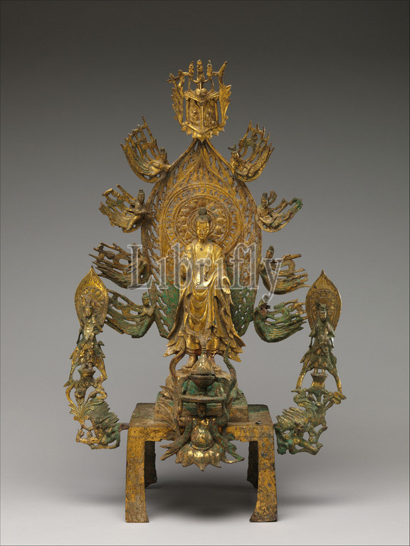 Altarpiece, dedicated, Buddha, Maitreya, Mile fo, 彌勒佛, late Northern Wei, 386–534, –Eastern, 534–550, dynasty, ca, 525–35, China, Gilt bronze, piece-mold, lost-wax cast, H, 23 1/4, 59.1 cm, W, 15, 38.1, D, 7 1/2, 19.1, Sculpture, Buddha, altarpiece, identified, Buddha Maitreya, upon, comparison, larger dated, inscribed altarpiece, collection, surrounded, entourage, music, apsaras, angel, beings, frequently, Buddhist art