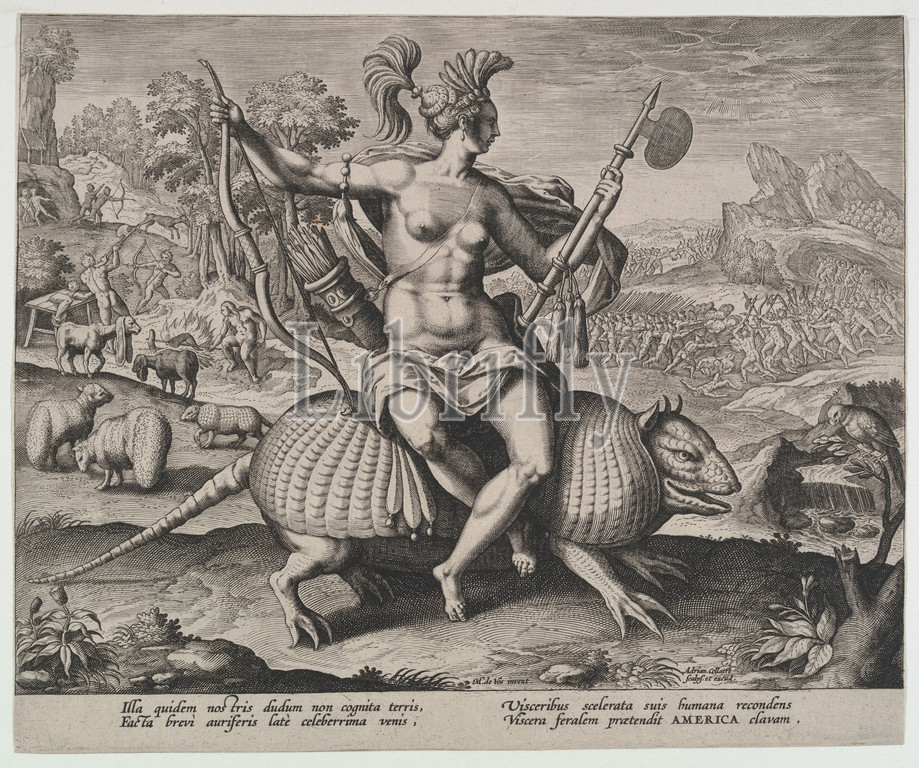 America, from the Four Continents, n.d., Engraving; second state, 8 3/8 x 10 1/16 in. (21.3 x 25.6 cm) (clipped), Prints, Adriaen Collaert (Netherlandish, Antwerp ca. 1560–1618 Antwerp), After Maerten de Vos (Netherlandish, Antwerp 1532–1603 Antwerp), This late sixteenth-century engraving made in Antwerp became an emblematic image of the New World. Series representing the 'four continents' were a popular conceit during the European age of exploration, when atlases were in high demand