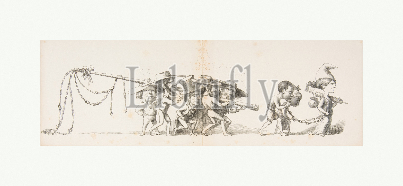America, from Pictures of Extra Articles and Visitors to the Exhibition, ca. 1851, Wood engraving, sheet: 4 3/4 x 13 7/8 in. (12.1 x 35.3 cm), Prints, Richard Doyle (British, London 1824–1883 London), London's Great Exhibition of the Works of Industry of All Nations was held in 1851 at the Crystal Palace, a huge glass-and-cast-iron hall specially erected in Hyde Park. International displays devoted to art, technology, and manufacturing delighted six million visitors over a five-month period