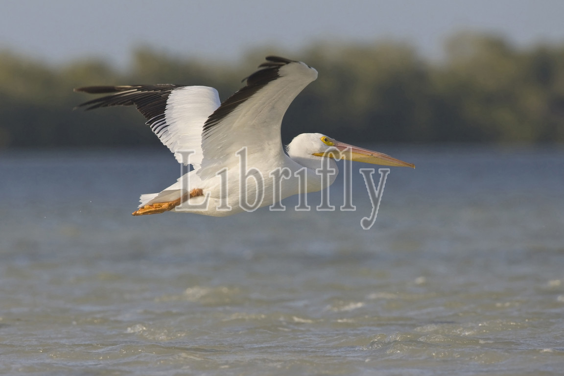 American White Pelican in flight above sea Yucatan Mexico, Pelecanus erythrorhynchos