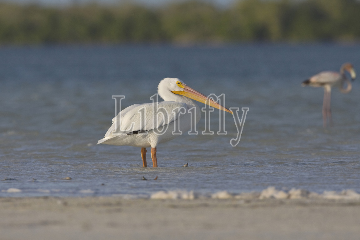 American White Pelican, standing, sand flat, Yucatan, Mexico, Pelecanus erythrorhynchos, nature, bird, animal, wildlife, wild, fauna, natural, feather, sky, beak, wing, outdoor, freedom, colourful, Liszt, Natural History, ornithology, vertebrate animals, photography, color image