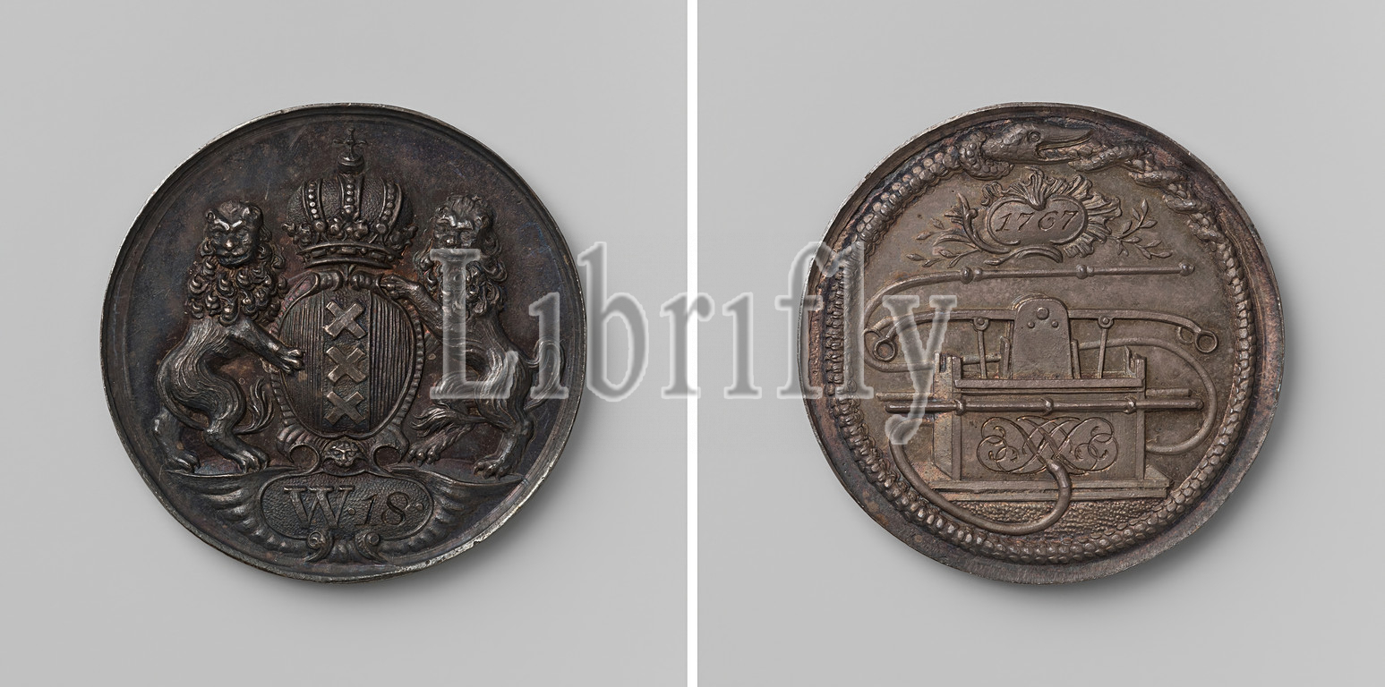Amsterdam, fire-spray badge from district 18, Silver Medal. Front: crowned coat of arms, flanked by two lions above cartouche with W 18 lettering. Reverse: fire spray under cartouche with year, adorned with leafy branches inside snake round, on fire spray side: monogram or decorative motif, anonymous, 1767, silver (metal), engraving, d 4.3 cm × w 28.83 gr