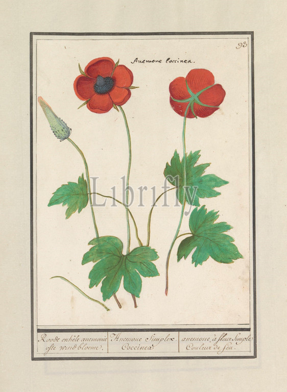 Anemone, Roode single anemony, wind flower, Anemone Simplex Coccinea, anemones à fleur Simple Couleur de feu, title, object, Red anemone, Numbered top right, 93, Latin name, Part, first album, drawings, flowers, plants, Eighth, twelve albums, animals, birds, 1600, commissioned, Emperor Rudolf II, explanations, Dutch, Latin, French, anemone, Anselmus Boetius de Boodt, 1596, 1610, paper, watercolor, paint, deck paint, chalk, ink, pen