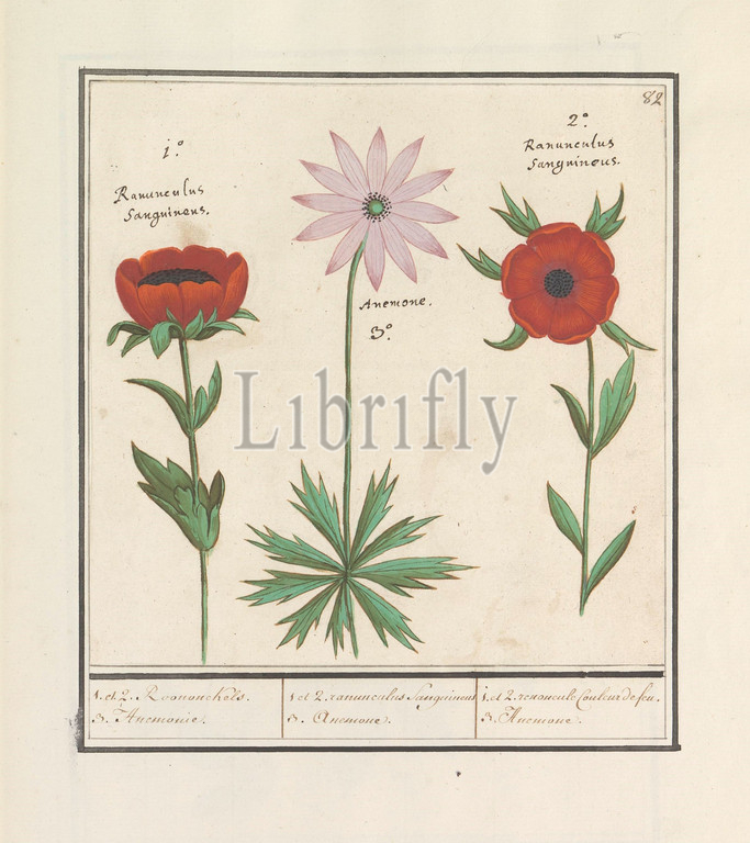 Anemone, 1, et 2, Roononckels, 3, Anemia, 2, ranunculus sanguineus 3, renoncule Couleur de feu, title, object, Red, pink anemone, Numbered top right, 82, Latin names, Part, first album, drawings, flowers, plants, Eighth, twelve albums, animals, birds, 1600, commissioned, Emperor Rudolf II, explanation, Dutch, Latin, French, anemone, Anselmus Boetius de Boodt, 1596, 1610, paper, watercolor, paint, deck paint, chalk, ink, pen