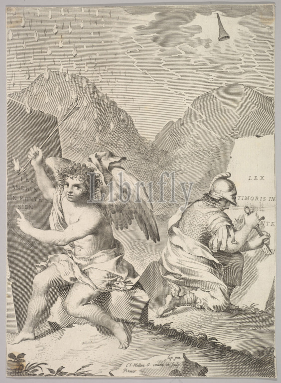 Angel, Soldier Inscribe Stone Slabs, Engraving, sheet, 10 1/4 x 7 1/2, 26.1 19.1 cm, Prints, Claude Mellan, French, Abbeville, 1598–1688, Paris