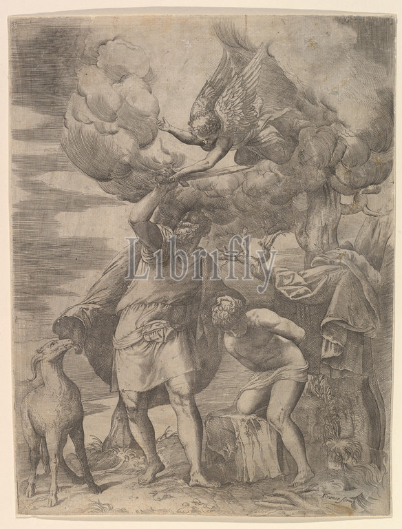 Angel Staying, Arm, Abraham, 1552, Etching, engraving, Second state, sheet, 14 x 10 7/16, 35.5 26.5 cm, trimmed, platemark, Prints, Battista Franco, Italian, Venice ca., 1510–1561, Venice