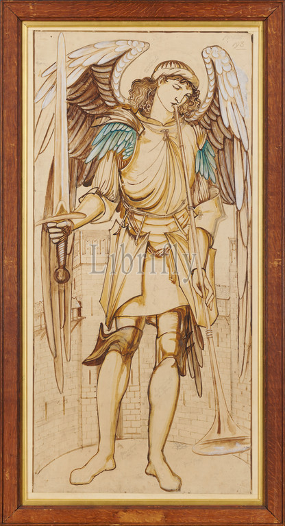 Angels, Hierarchy, Archangeli, 1873 Artist, Sir Edward Burne-Jones, d.1898, Assistant, Charles Fairfax Murray, d.1919, Manufacturer, Morris & Co, Design, Jesus College, Cambridge, Art Movement, Pre-Raphaelite, 19th Century, Sword, Drawing, Watercolour, Gouache, Paper, Angel, Frame, Mixed media, Wash drawing, Full-length, Works, Paper, Musical instrument, Trumpet