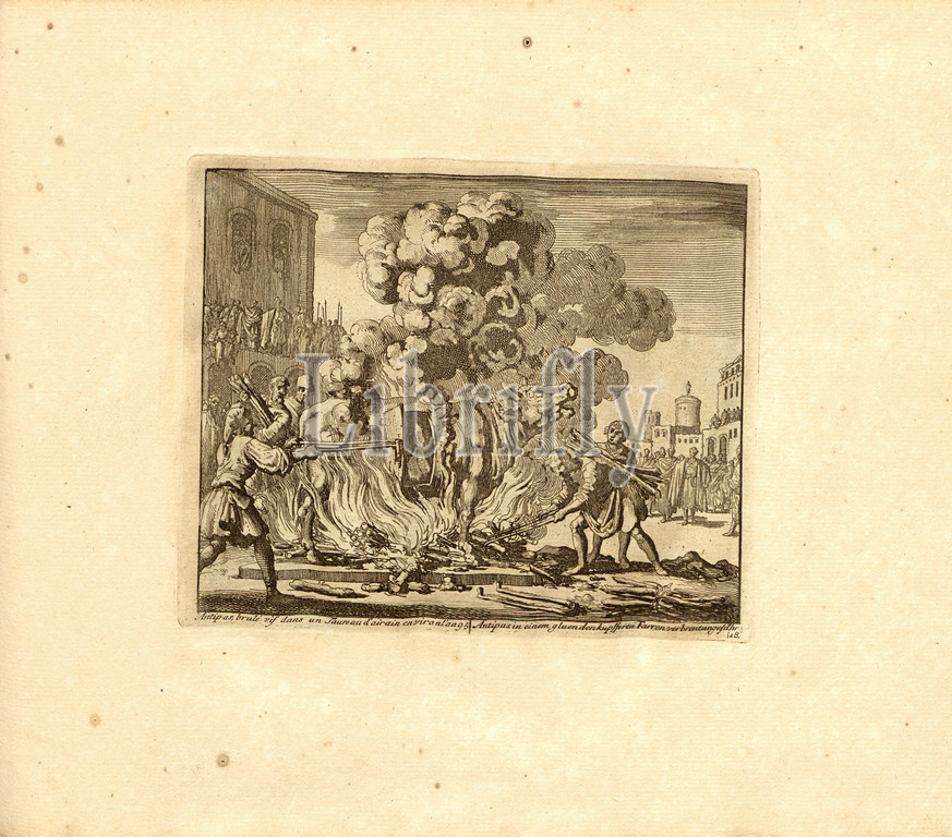 Anipas, burned alive in an air Bull about the year 95, Parallel title: Antipas in a glowing copper bull, approximately, copperplate engraving, 18.), p. 45, Luyken, Jan (inv. et fec.), Jan Luyken: Théâtre des martyrs: depuis la mort de J.Christ jusqu'à present: représenté en très belles tailles-douces = Schau-Bühne der Martyrer; gezeichnet und in Kuppfer gestochen. Leyde: chez Pierre Van der Aa, [1711]