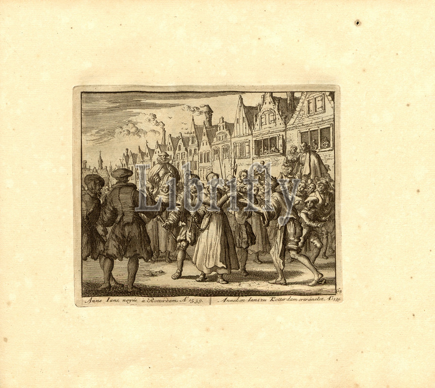 Anne Ians drowned in Rotterdam, Anno 1539, Parallel title: Anneken Ians drowned in Rotterdam, A nn o 1539, copperplate engraving, 63.), p. 135, Luyken, Jan (inv. et fec.), Jan Luyken: Théâtre des martyrs: depuis la mort de J.Christ jusqu'à present: représenté en très belles tailles-douces = Schau-Bühne der Martyrer; gezeichnet und in Kuppfer gestochen. Leyde: chez Pierre Van der Aa, [1711]
