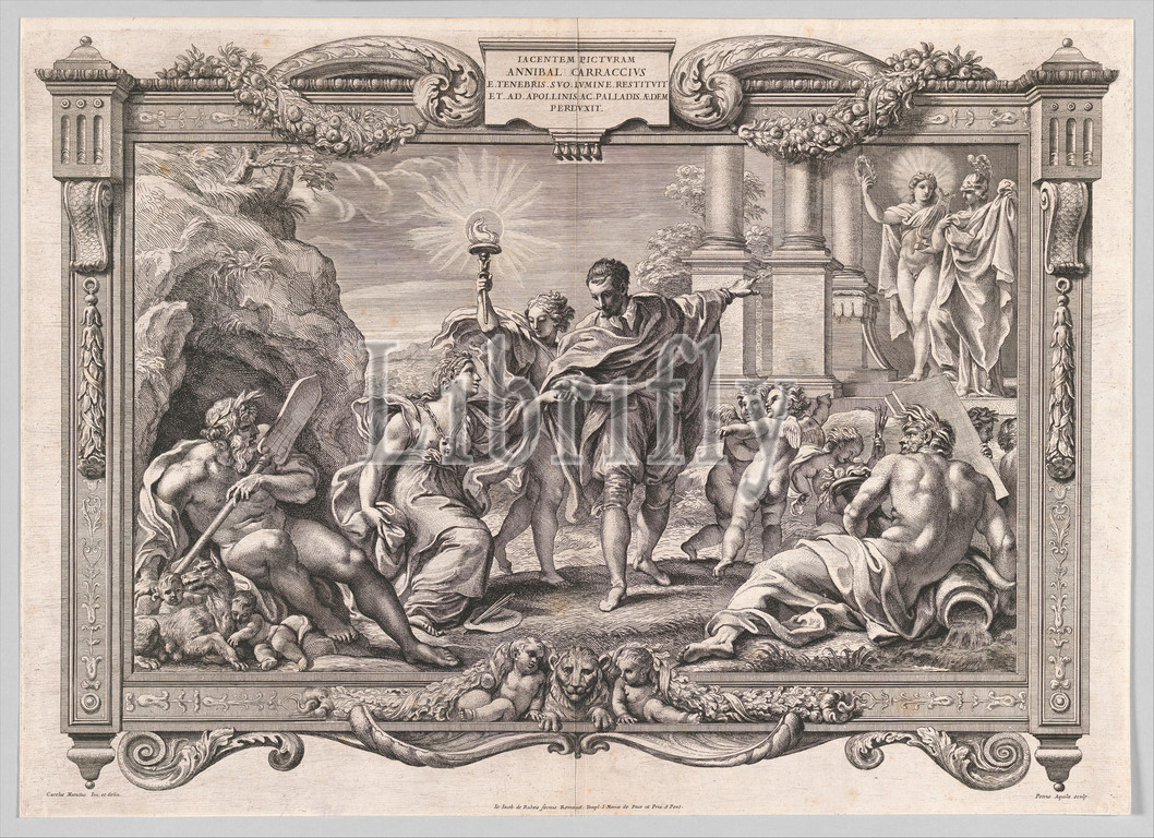 Annibale Carracci Introduces Painting to Apollo and Minerva, 1674, Etching and engraving, Sheet: 18 1/8 x 25 1/4 in. (46 x 64.1 cm), Prints, Pietro Aquila (Italian, Marsala, Sicily 1650–1692/1700 Rome), After a drawing by Carlo Maratti (Italian, Camerano 1625–1713 Rome), This print appeared as a frontispiece to a book of etchings depicting the frescoes painted by Annibale Carracci in the Farnese Gallery in Rome. Like the publication of the book itself, this frontispiece was part of a concerted effort to raise the painter, active at the turn of the seventeenth century, to mythical status