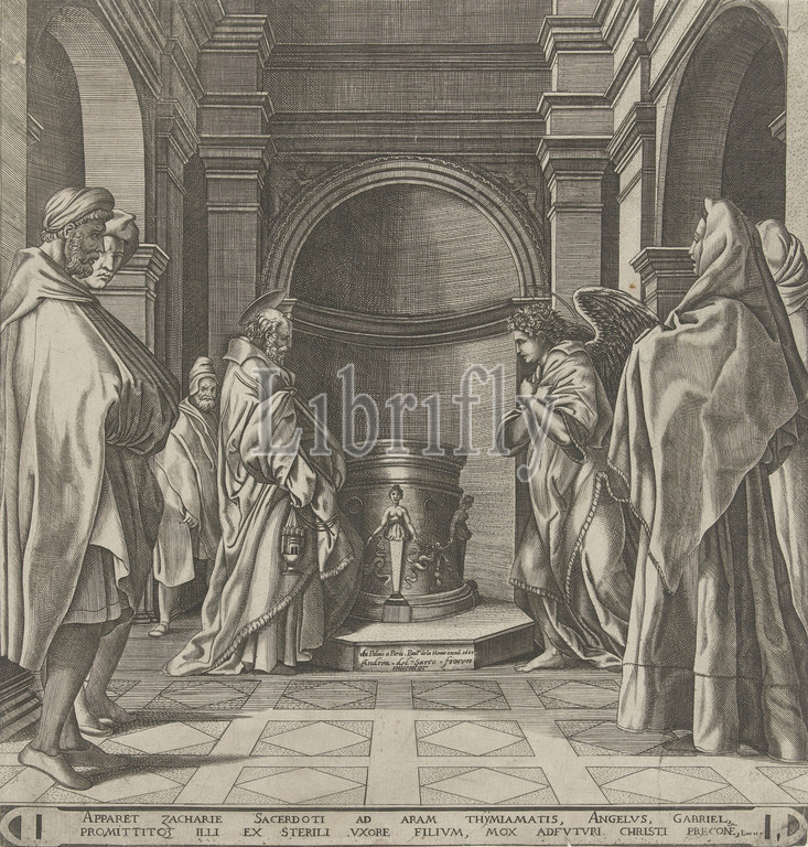 Announcement, Zacharias, interior, temple stands, high priest Zacharias, censer, hand, Opposite, archangel Gabriel, announces, birth, son, John, Baptist, two lines, Latin, Luc, 1, annunciation, offering incense, temple, angel, Gabriel, Pieter van der Heyden, mentioned, object, Antwerp, 1601, paper, engraving