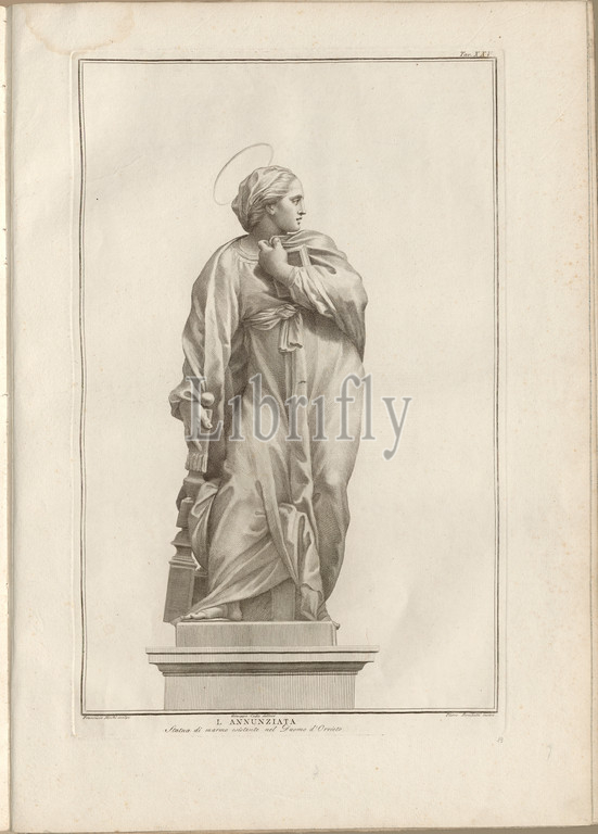 The Annunciation, Marble statue in the Orvieto Cathedral, signed: Francesco Mochi scolpi; Giuseppe Cades delineo; Pietro Bombelli incise, Tav., XXV, Mochi, Francesco (scolpi); Cades, Giuseppe (delineo); Bombelli, Pietro (incise), Guglielmo Della Valle: Storia del duomo di Orvieto. Roma: presso i Lazzarini, MDCCXCI [1791]