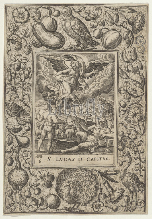 Annunciation, Shepherds, 1580–1600, Engraving, Sheet, 4 15/16, 3 7/16, 12.6, 8.7 cm, Abraham de Bruyn, Flemish, Antwerp, 1540–1587, Cologne, Scene, Archangel descends, center, four shepherds, right reclining, Surrounding, scene, wide frame, peacock, bottom center, another bird, top, amongst fruit, vegetables
