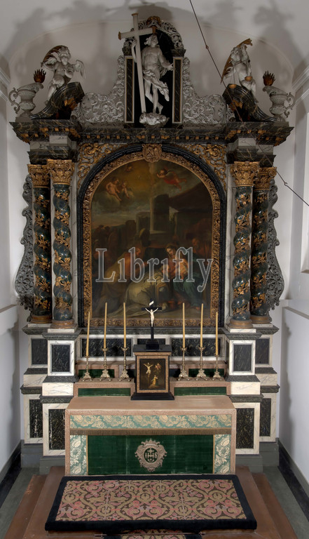 Anonymous, c. 1694, alder, wood, iron, cross, angel, christ, Leiden, Interior consisting of a baroque altar with side gates from the old Catholic church on the Hooigracht in Leiden. The painted wooden baroque altar 3847.1 has double twisted columns and a pediment decorated with a statue of the Risen Christ. The altar has a superstructure with a curved painting by Willem van Ingen S 729. The doors of the side gates 3847.2 and 3847.3 are painted with resp. Expulsion from Paradise inv.no. S 730 and Christ appears to Magdalena inv. S 731 by Willem van Ingen. They are encapsulated in a simple pilaster architecture, awarded with resp. a statue of Mary with Christ child and Joseph with Christ boy, 1926
