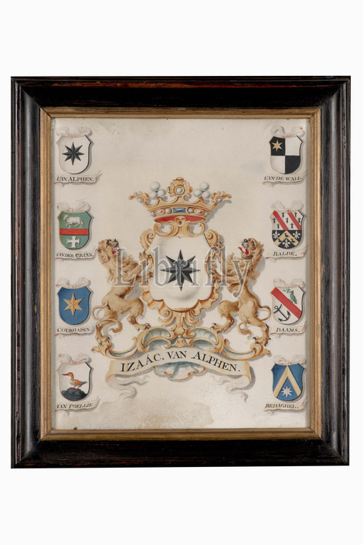 Anonymous, 18th century, parchment, wood, glass, Carrier: approx. 30.5 × 25cm (305 × 250mm), family crest, Color drawing on parchment with the coat of arms of Izaac van Alphen, husband of Catharina Marie de Ruever. The weapon has an eight-pointed star. Above the weapon is a crown and curls around the weapon. Under the coat of arms on a band is Izaac van Alphen. Around the coat of arms are eight quarter-arms: on the left the arms of Van Alphen, Van der Cruys, Courhagen and Van Poellien and on the right the arms Van der Wall, Balde, Daams and Behaghel. Weapon is in a black painted wooden frame with a gilded inner edge and is behind glass, 1883