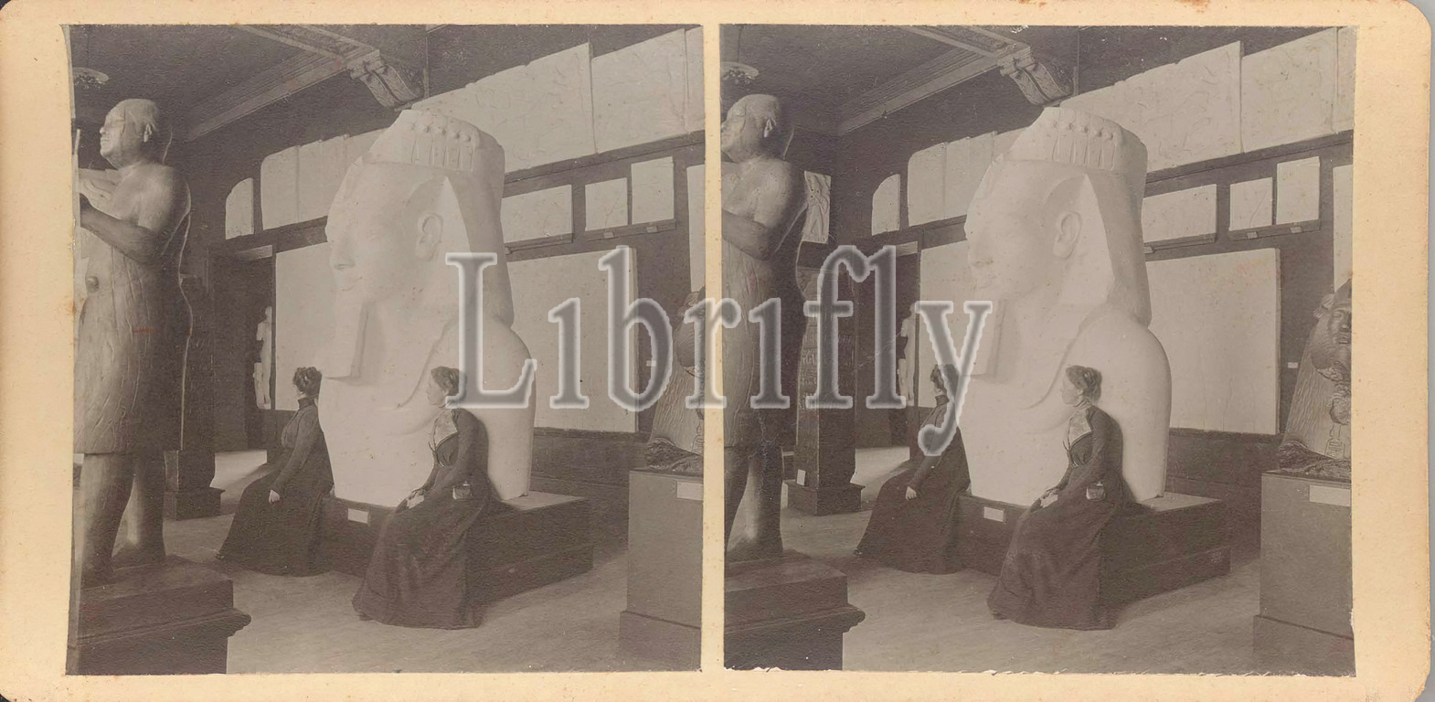 Anonymous Artist, Two Women Seated by Plaster Cast of Statue of Ramesses II, between 1890 and 1900, albumen stereo print mounted on cream card, Mount (card): 3 1/2 × 7 inches (8.9 × 17.8 cm)