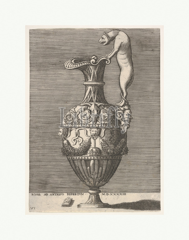 Antique Ewer, Handle, Shape, Lioness, Vases, Antique, ca, 1543–1573, Engraving, second state, image, 10 1/16 x 7 3/16, 25.6 18.3 cm, cropped within plate mark, sides, Enea Vico, Italian, Parma, 1523–1567, Ferrara, ewer, handle, shape, lioness, ewer, further covered, various antique, motifs, bovine skull, garlands suspended, lion-shaped masks, composite series, published, Antonio Lafreri, vase designs, antique, Agostino Veneziano