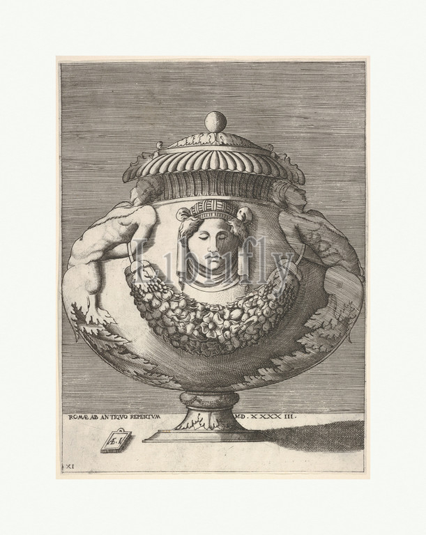 Antique Lidded Urn, Hybrid Male Sphinxes, Female Mask, Body, Vases, Antique, 1543, Engraving, first, second state, image, 10 3/8 x 7 11/16, 26.4 19.5 cm, cropped within plate mark, sides, Enea Vico, Italian, Parma, 1523–1567, Ferrara, lidded, urn, hybrid male, sphinxes, side, body, vessel, supporting, lid, Suspended, richly filled, garland, fruits, flowers, mask, shape, female head, turban, depicted