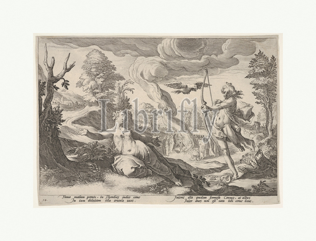 Apollo, Coronis, Engraving, sheet, 7 1/16 x 10 1/16, 18 25.5 cm, Prints, possibly, by Robert Willemsz de Baudous, Netherlandish, 1574/5–1659, After Hendrick Goltzius, Mühlbracht, 1558–1617, Haarlem
