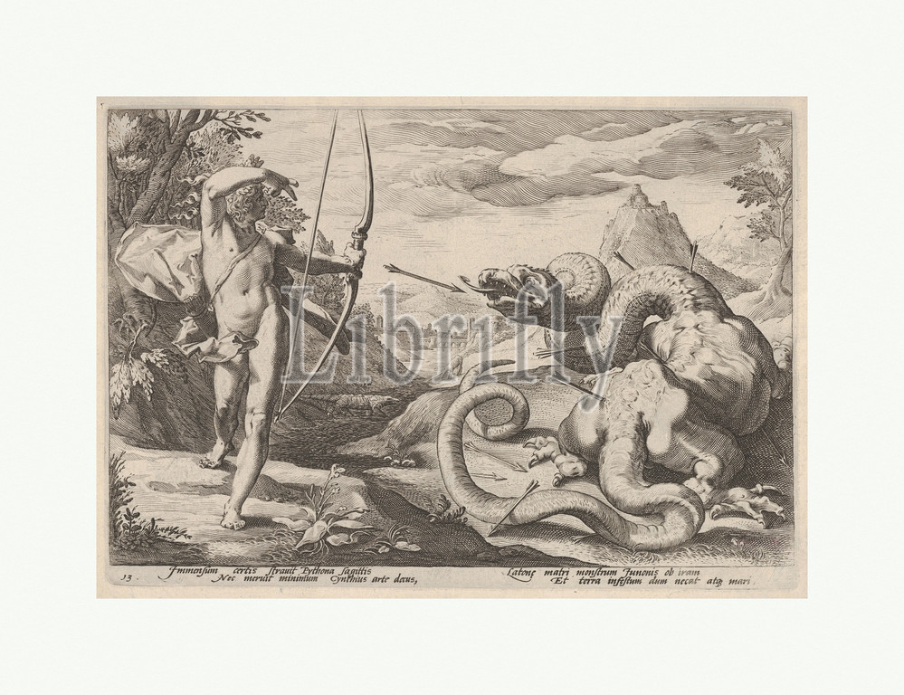 Apollo Killing, Python, Engraving, plate, 6 7/8 x 9 13/16, 17.4 25 cm, Prints, possibly, by Robert Willemsz de Baudous, Netherlandish, 1574/5–1659, After Hendrick Goltzius, Mühlbracht, 1558–1617, Haarlem