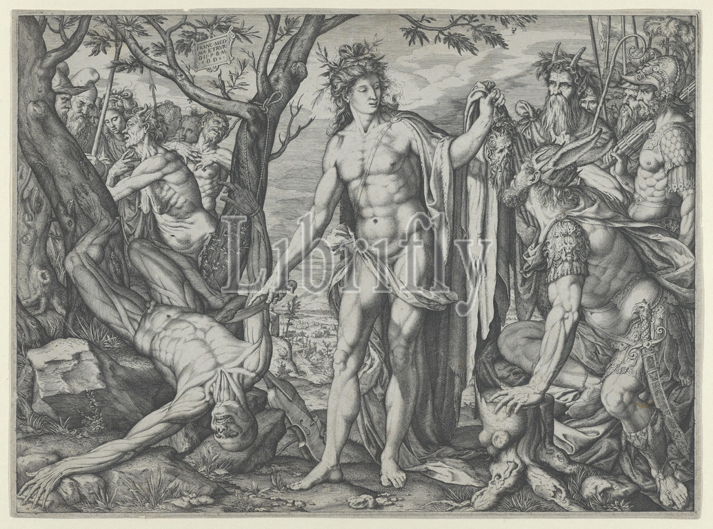 Apollo, Marsyas, Judgment, Midas, 1581, Engraving, Sheet, 9 3/16 x 12 9/16, 23.4 31.9 cm, Prints, Melchior Meier, German, active Italy, ca., 1572–82, According, Ovid, Apollo engaged, two musical competitions, Marsyas boasted, flute playing, rival, music, god proved, superiority, punished Marsyas, flaying, alive