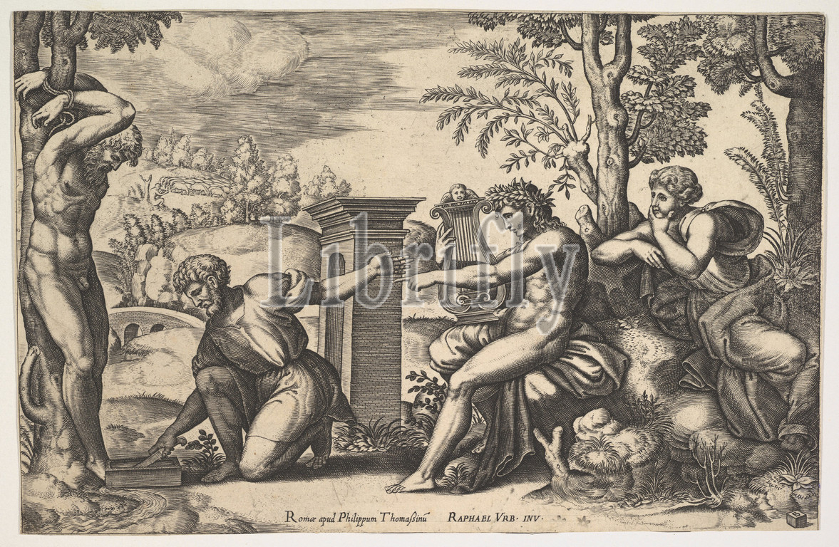 Apollo seated at the right with a lyre on his knee, pointing to a kneeling man who is about to flay Marsyas who is tied naked to a tree at left, 1530–60, Engraving, sheet: 7 1/16 x 11 in. (18 x 28 cm), Prints, Master of the Die (Italian, active Rome, ca. 1530–60)