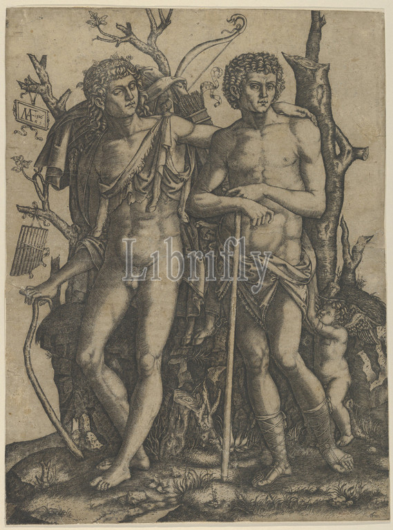 Apollo standing at the left, his hand resting on the shoulder of Hyacinthus, Cupid in the lower right, 1506, Engraving, 8 7/8 x 11 3/4 in. (22.5 x 29.9 cm), Prints, Marcantonio Raimondi (Italian, Argini (?) ca. 1480–before 1534 Bologna (?)), After (?) by Francesco Francia (Italian, Bologna ca. 1447–1517 Bologna)