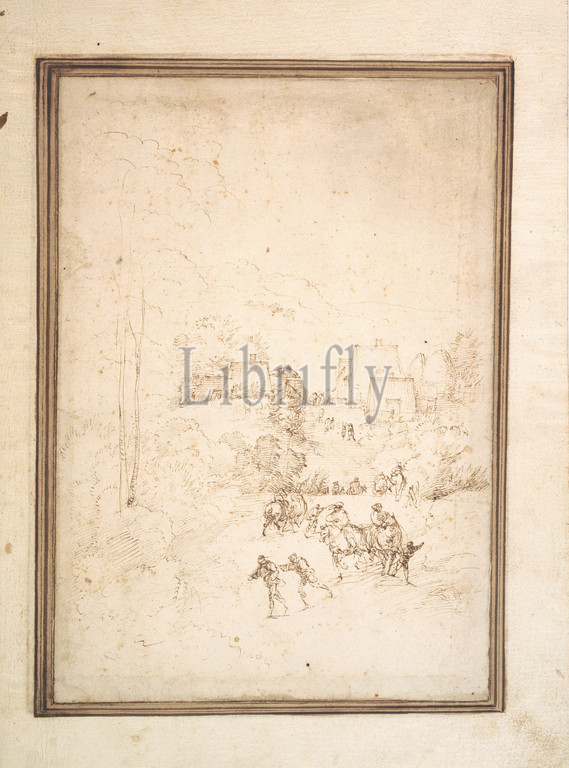 Approach, Mountain Village, Horsemen, Road, ca, 1501, Pen, brown ink, traces, black chalk, mounted, album page, 11 3/4 x 8 1/8, 29.8 20.6 cm, Drawings, Fra Bartolomeo, Bartolomeo di Paolo del Fattorino, Italian, Florence, 1473–1517, significant early example, pure landscape, drawing, produced infrequently, European art, early sixteenth, century, sheet comes, now-disbound album, landscape studies, assembled, eighteenth-century collector