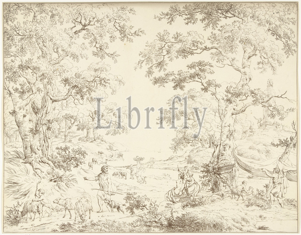 Arcadian landscape, Janus statue, Landscape, tall trees, people, sheep, banks, river, foreground, shepherd, dog, child, three sheep, background, right, hill, pastorals, Arcadian scenes, Janus' head, two-faced head, Hermanus Fock, Amsterdam, 1781, 1822, paper, etching