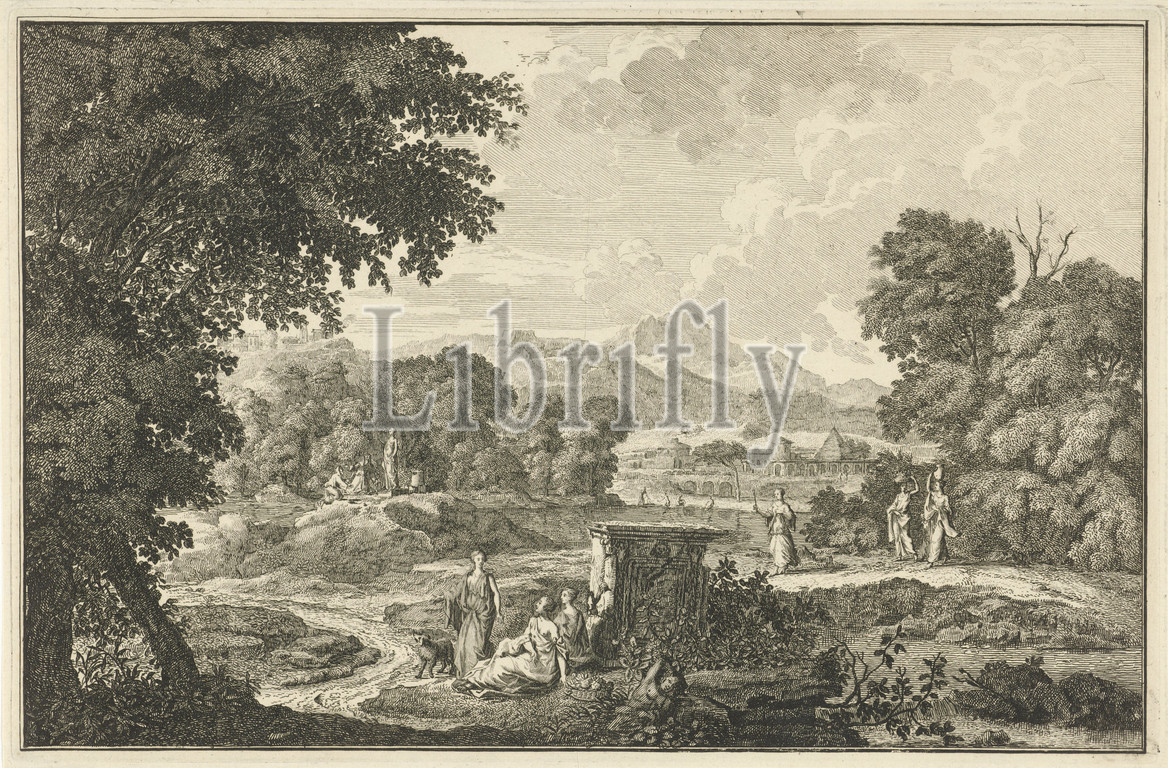 Arcadian landscape with six women near a tomb Italian and German landscapes (series title), Arcadian landscape with six women and a dog near a tomb. In the background two figures are kneeling in front of a statue. The print is part of a 40-part series of prints with representations of Italian and German landscapes, dog, landscapes with waters, waterscapes, seascapes (in the temperate zone), grave, tomb, statues, paintings, etc., objects of worship in Roman religion, Adolf van der Laan, Amsterdam, 1721 and/or 1710 - 1747, paper, etching, h 240 mm × w 367 mm