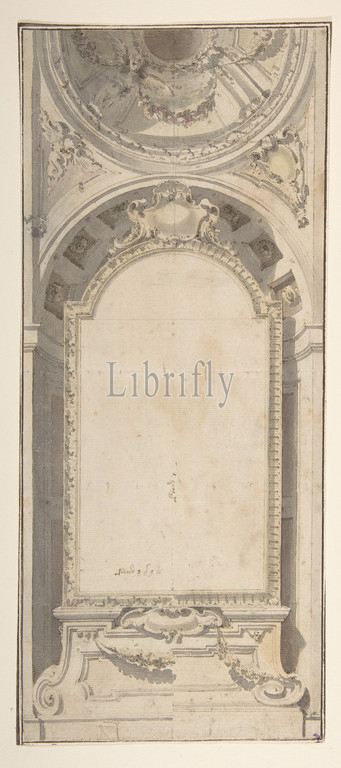 Architectural Design, Altarpiece Framed, Niche, Surmounted, Dome, 1735–1817, Pen, brown ink, brush, brown, gray, yellow, rose wash, vertical line, leadpoint, half part, drawing, center, create, symmetry, 13-1/2 x 5-3/4, 34.3 14.6 cm, irregular borders, Flaminio Innocenzo Minozzi, Italian, Bologna